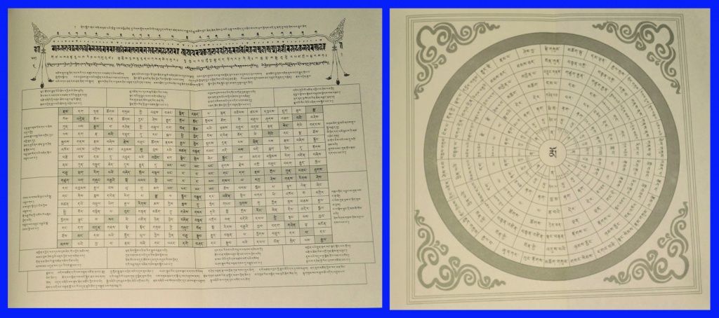 Если читать верхнюю строку по прямой, то первый слог «де» в верхнем левом углу становится частью слова «девар» («блаженно»), и строка восхваляет реализацию Ньямме Шераба Гьялцена Ринпоче.
