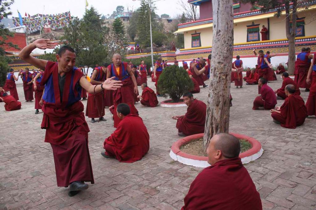 Дебаты монахи практикуют в парах. Один из них (сидящий) становится «защищающимся» — он выдвигает тезис и стремится непротиворечиво защитить его с помощью истинных утверждений. Стоящий второй монах («вопрошатель») ставит под сомнение обоснованность утверждений, выдвинутых защищающимся, и пытается привести его к мыслям, противоречащим его тезису.