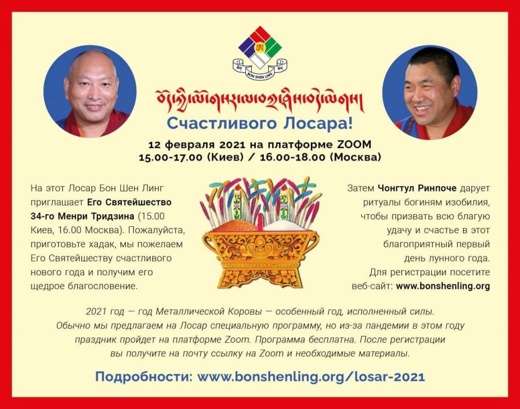 Центр Бон Шен Линг приглашает всех желающих присоединиться к празднованию Лосара онлайн с Чонгтулом Ринпоче и Его Святейшеством 34 Менри Тризином 12 февраля в 16:00 по Москве.