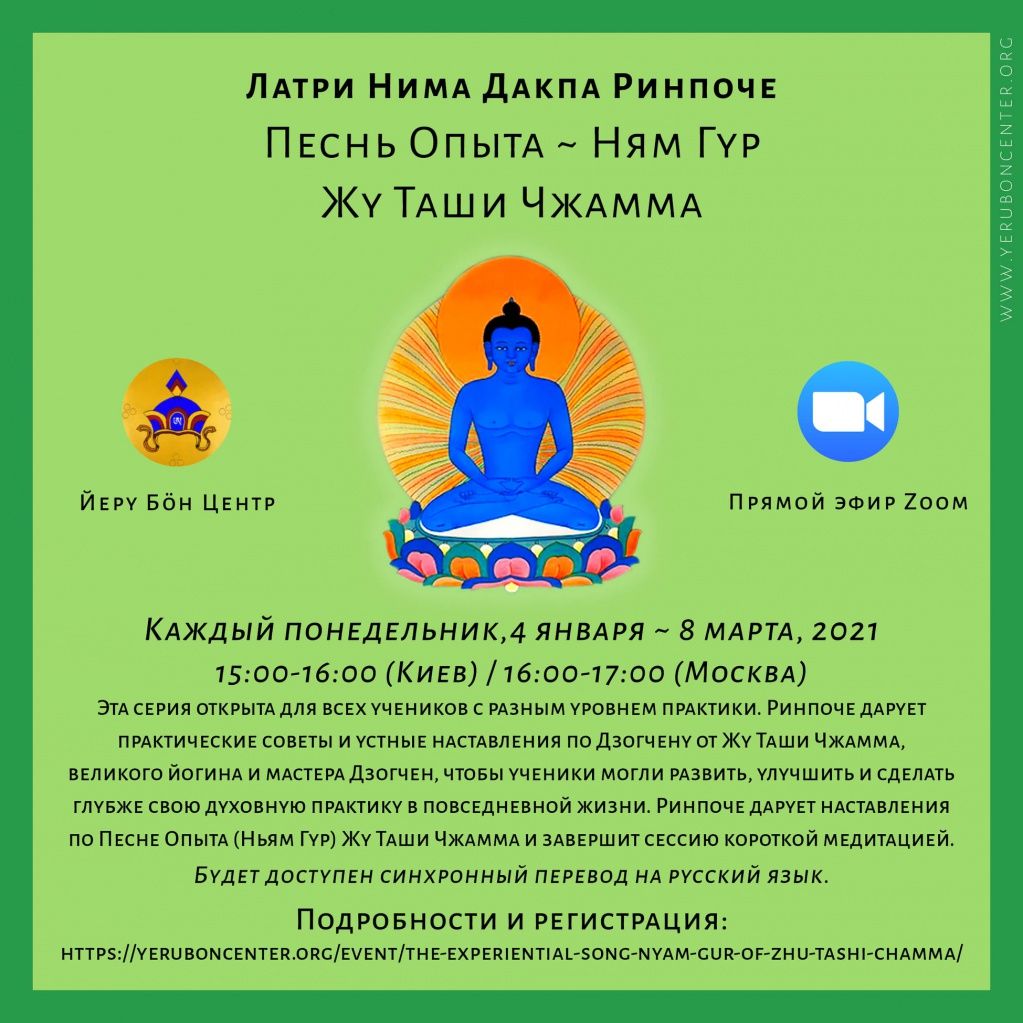 Каждый понедельник, с 4 января по 8 марта 2021, Латри Нима Дакпа Ринпоче дарует практические советы и устные наставления по Дзогчену от Жу Таши Чжамма, великого йогина и мастера Дзогчен, чтобы ученики могли развить, улучшить и сделать глубже свою духовную практику в повседневной жизни. Ринпоче дарует наставления по Песне Опыта (Ньям Гур) Жу Таши Чжамма и завершит сессию короткой медитацией.