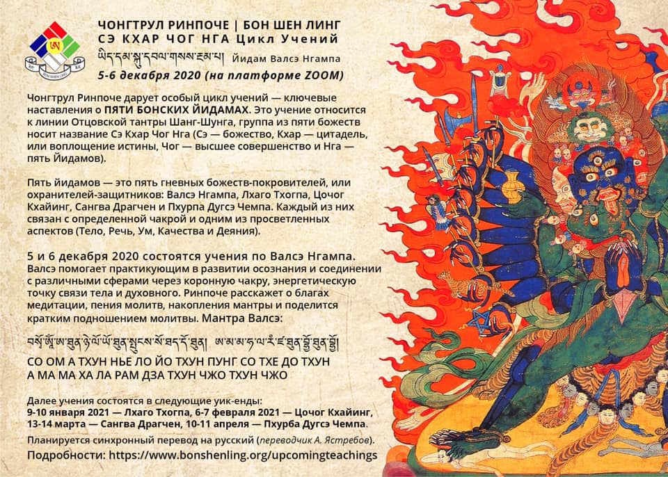 Чонгтул Ринпоче дарует цикл учений СЭ КХАР ЧОГ НГА — ключевые наставления о Пяти бонских йидамах. Первая часть учений состоится 5 и 6 декабря 2020.