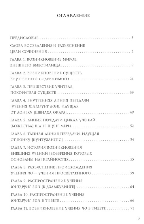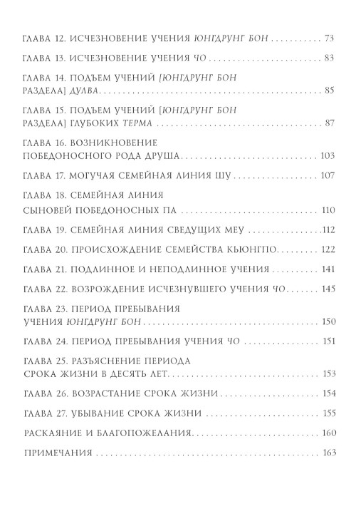 В книге освещены история учения юнгдрунг бон, история учения Будды Шакьямуни и учение о происхождении Вселенной, принятое в тибетской традиции. Книга также подробно рассказывает о трех линиях передачи: внешней, внутренней и тайной — до (сутры), учения тайной нгаг (тантры) и дзогчена, великого совершенства.