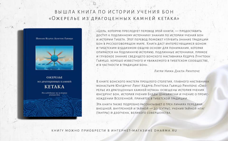 Вышла новая книга — исследование по истории учения бон «Ожерелье из драгоценных камней кетака». Автор — Понлоб Кедруб Лунгток Гьямцо, бонский мастер прошлого столетия, главный наставник монастыря Юнгдрунг Линг.